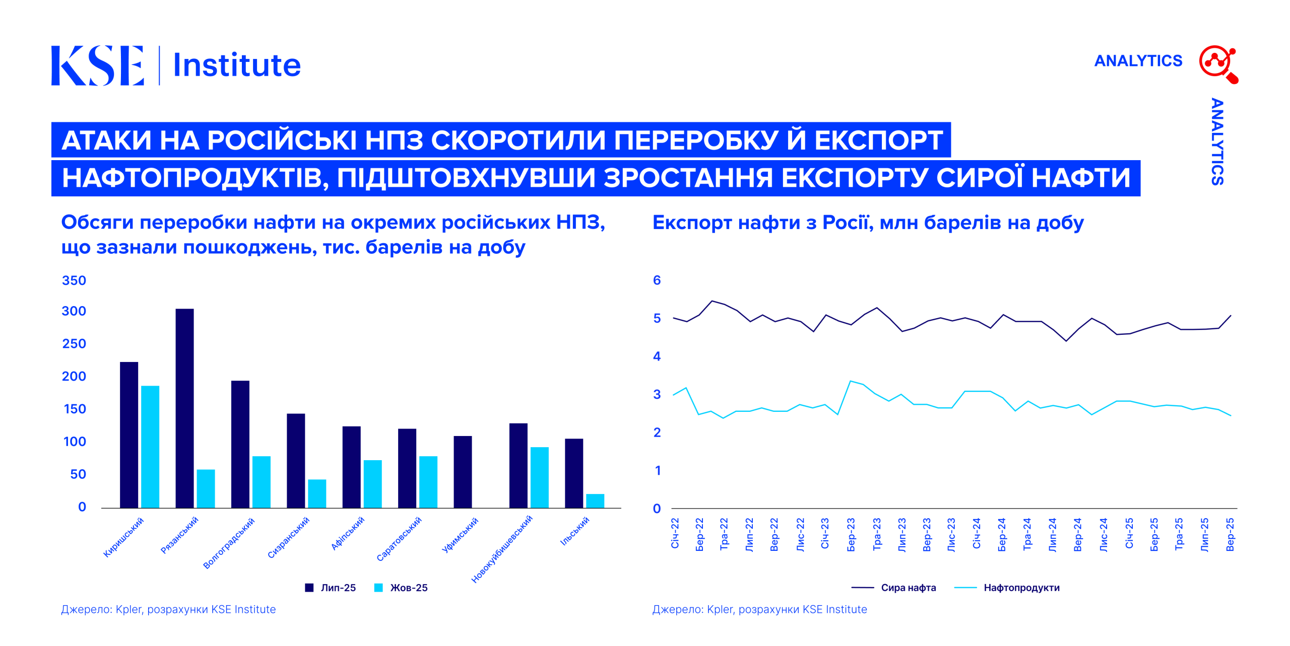 У вересні 2025 року доходи Росії від експорту нафти скоротилися приблизно на $0,2 млрд — до $13,4 млрд порівняно з серпнем, згідно з жовтневим випуском Russian Oil Tracker від KSE Institute. Доходи від експорту сирої нафти зросли на $0,2 млрд до $9,0 млрд, однак падіння доходів від нафтопродуктів на $0,4 млрд — до $4,4 млрд — повністю нівелювало цей приріст.