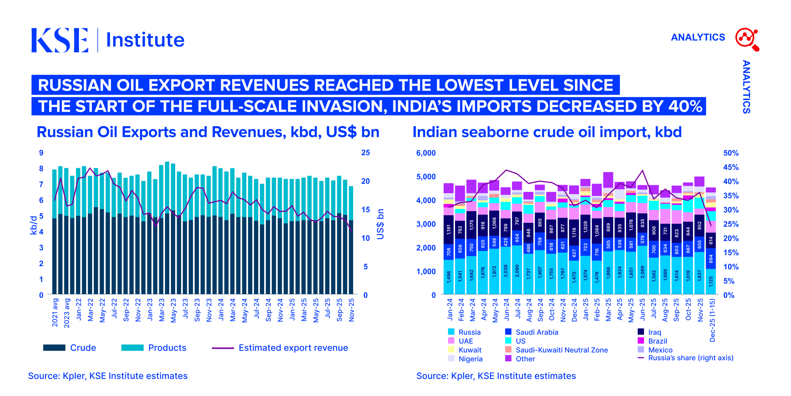 In November 2025, Russia’s oil export revenues decreased by ~$1.9 bn MoM to $11.0 bn, according to the December edition of the Russian Oil Tracker by the KSE Institute. This is the lowest level since the start of the war. Revenues from crude oil exports fell by $1.6 bn to $7.1 bn, while revenues from oil products declined by $0.3 bn to $3.9 bn.