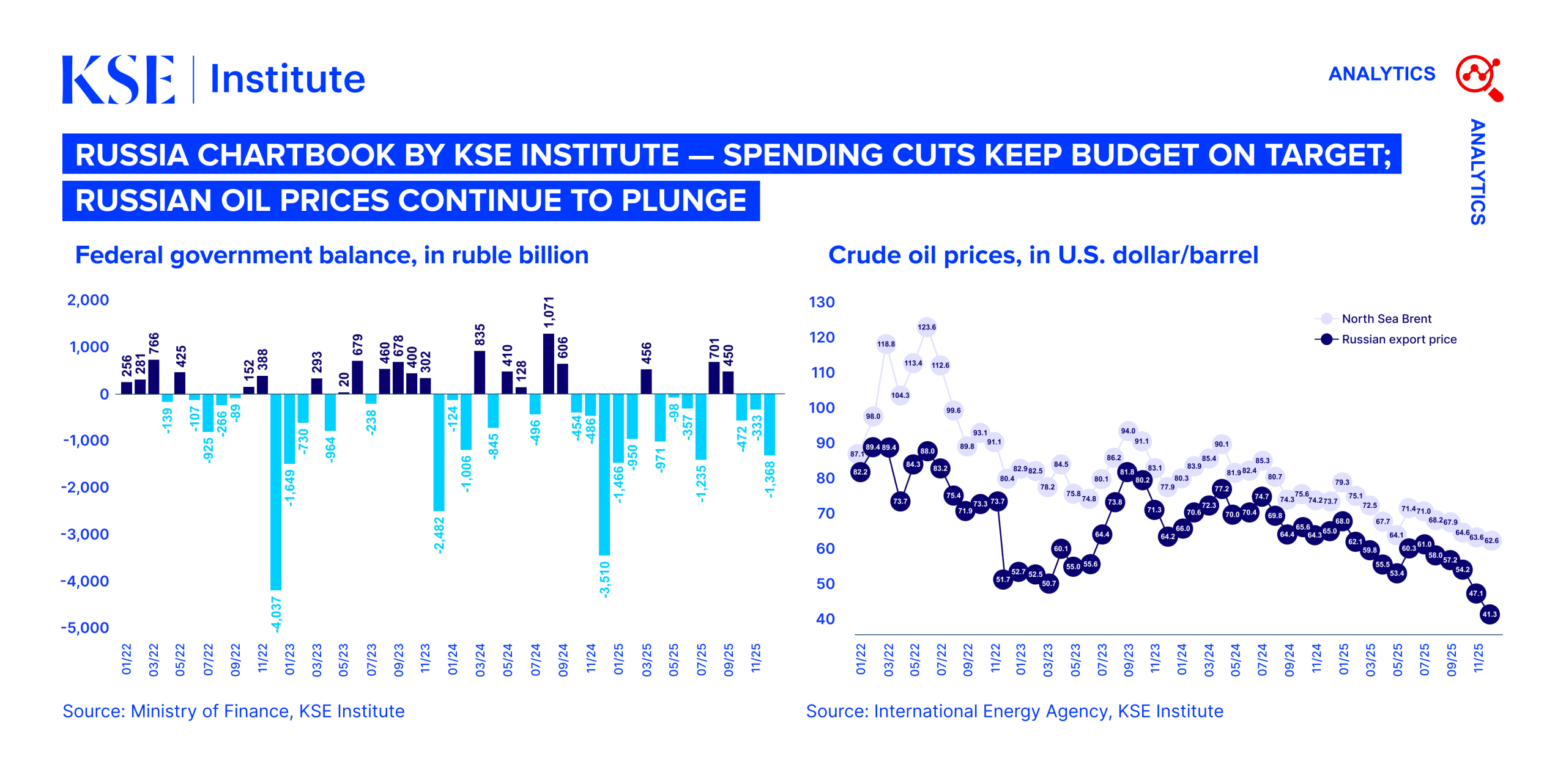 KSE Institute has published the January edition of its Russia Chartbook, “Spending Cuts Keep Budget on Target; Russian Oil Prices Continue to Plunge.” While Russia formally met its revised budget target for 2025, underlying financial and macroeconomic constraints continue to intensify. This creates a favourable moment for Ukraine’s partners to step up sanctions pressure and further constrain the Kremlin’s ability to finance the war.