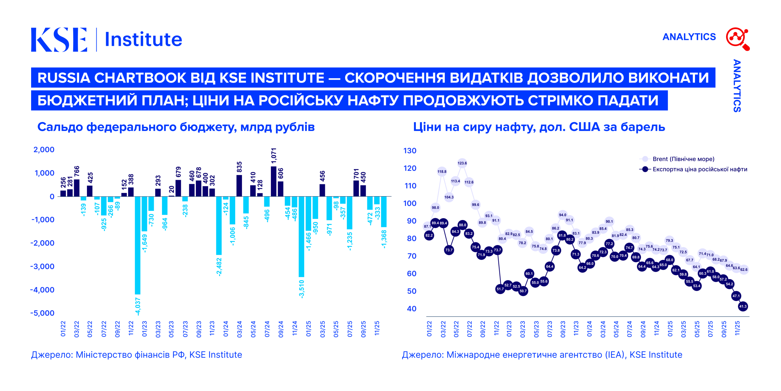 KSE Institute опублікував січневий випуск Russia Chartbook: «Скорочення видатків дозволило виконати бюджетний план; ціни на російську нафту продовжують стрімко падати». Попри формальне виконання бюджетної цілі за підсумками 2025 року, фінансові та макроекономічні обмеження Росії посилюються. Це створює сприятливий момент для союзників України, щоб посилити санкційний тиск і обмежити здатність Кремля фінансувати війну.