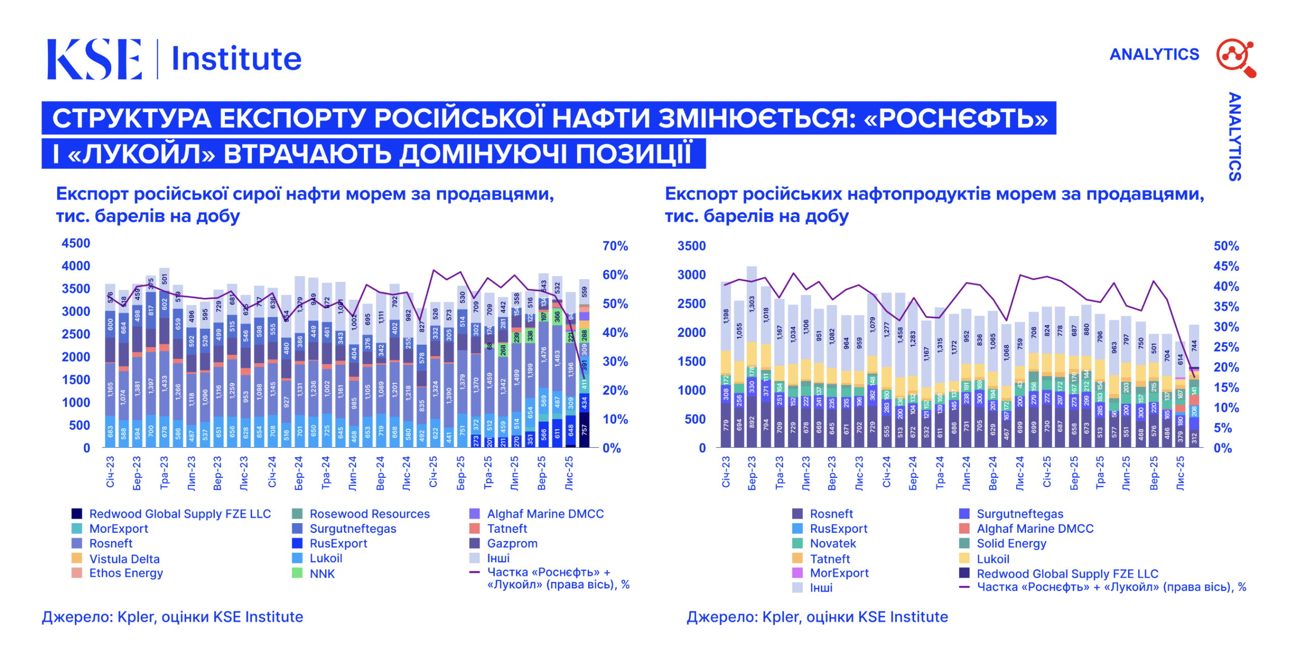 У грудні також змінилася структура продавців російської сирої нафти. Частка «Роснєфті» та «Лукойлу» в експорті впала з 51% у 2023–2024 роках до 19% у грудні 2025 року, що вказує на перебудову експортних ланцюгів та посилення ролі альтернативних трейдерів. На ринок вийшли нові експортери — Redwood Global Supply FZE LLC, Vistula Delta, Ethos Energy та Rosewood Resources, які разом забезпечили 29% загального експорту сирої нафти у грудні.