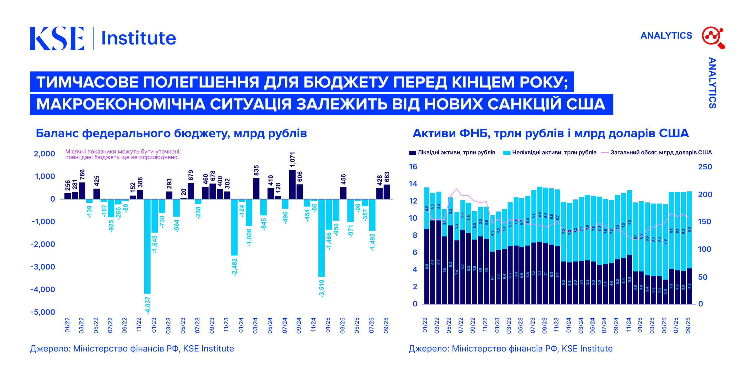 KSE Institute опублікував жовтневий випуск Russia Chartbook: «Тимчасове полегшення для бюджету перед кінцем року; макроекономічна ситуація залежить від нових санкцій США». Посилення фінансових та економічних труднощів Росії створює можливість для союзників України посилити санкційний та економічний тиск, щоб обмежити здатність Кремля фінансувати війну.